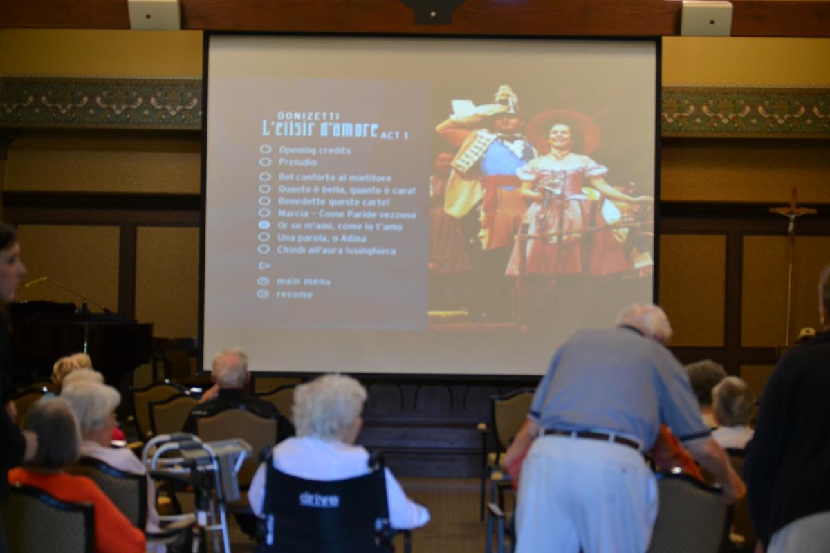 Residents of Ecumen Lakeshore now have the opportunity to view a new opera each quarter. On June 18 the group saw Gaetano Donizetti’s Opera, L’ Elisir d’ Amore (The Elixir of Love) and applauded enthusiastically. Residents stayed for discussion, h'ordeuvres and wine following the showing.