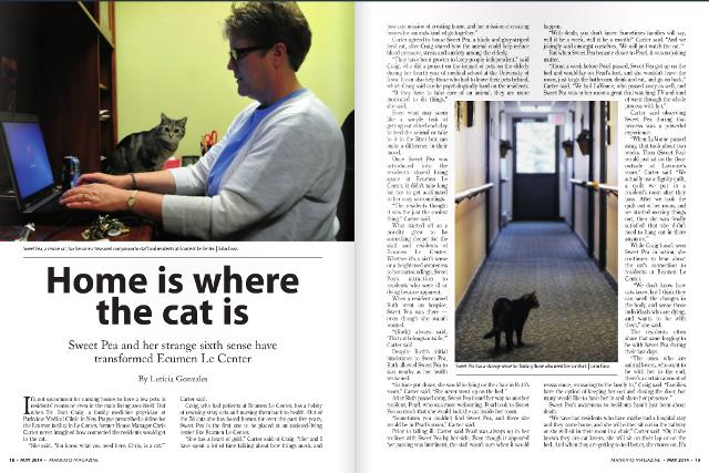 Word of Sweet Pea’s exceptional sixth sense has spread to the surrounding area. In its May issue, the Mankato Free Press’s Mankato Magazine carries a touching profile of Sweet Pea by writer Leticia Gonzales, who gracefully tells the story of the cat who helps people in their time of greatest need.