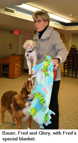 Bauer is a herding dog with lots of energy. Sometimes too much. Today he got kicked out of exercise class for being too rowdy. Whatever. He just went to memory care, where the recreational therapy group was falling asleep. Bauer lit up the room.